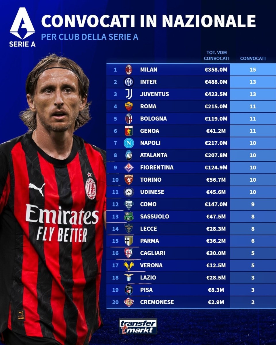 10月国际比赛日意甲球队被征召人数:米兰15人,国米尤文13人